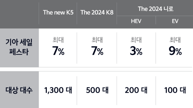 기아는 정규리그 및 한국시리즈 통합 우승을 응원해 준 야구 팬과 고객 성원에 보답하기 위해 ‘기아 세일페스타’를 열고, 총 8개 차종을 대상으로 특별 할인 혜택을 제공하는 특별한 기회입니다. 생산 월 조건에 따라 최대 12% 할인하는, 총 5000대 한정으로 선착순 혜택이 제공되며 차종별 한정 수량이 소진될 시 조기 마감된다고 합니다. 차량구매를 준비하고 계신 분들께는 이번 기아세일페스타의 기아자동차 특별할인 혜택으로 기아차의 주요차량을 가장 합리적으로 만나 볼 수 있는 기회 입니다. 좋은 혜택 놓치지 마시기 바랍니다.