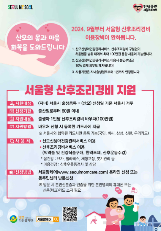 저출생 극복을 위한 서울시의 서울형 산후조리경비 지원사업이 1년을 맞아 9월 1일부터 산모들이 더욱 편리하게 이용할 수 있도록 개선됩니다. 기존 지원내용에서 달라지는 편리혜택을 미리 확인하시어 손해 보시는 일 없이 시길 바랍니다.