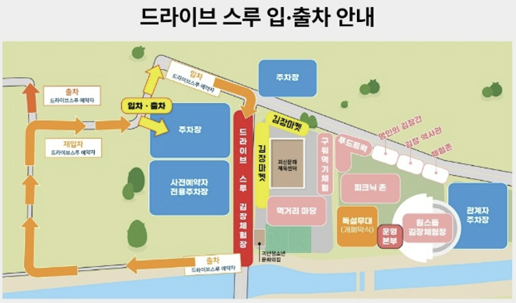 - 방법 : 드라이브-스루 체험방식은 사전 예약한 시간에 괴산문화체육센터 앞 도로에 개별 차량 진입으로 드라이브-스루 김장담그기 구역에서 일행 별 1부스 제공되어 김장 담그기가 진행됩니다.