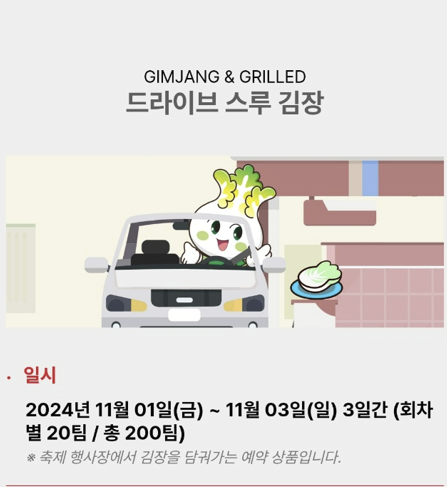 - 내용 : 축제 행사장에서 김장을 담궈가는 예약 상품
