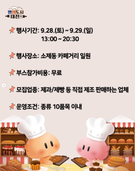 빵을 좋아하시는 분들이 고대하시는 빵축제인 2024 대전 빵축제의 일정이 나왔습니다. 작년에는 10월 중순에 개최되었지만, 추석연휴 후 9월 마지막 주에 더욱 빠르게 개최가 됩니다. 다양하고 맛있는 빵과 즐길거리 가득한 축제를 만나시기 바랍니다.