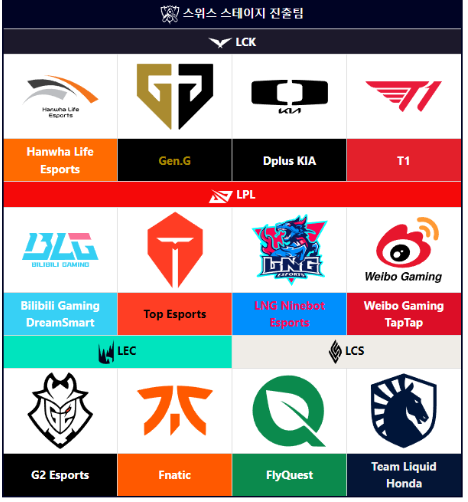 - T1 : 한국의 전통 강호로, 여러 차례 롤드컵 우승 경험이 있는 팀입니다. 최근 성적이 좋으며, 이번 대회에서도 강력한 우승 후보로 꼽히고 있습니다.