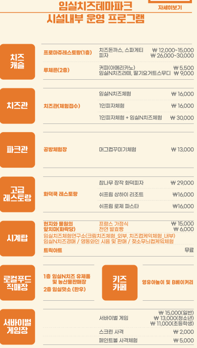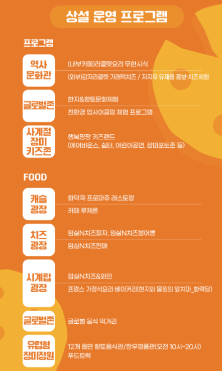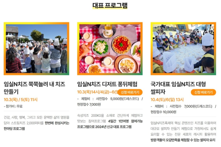 1) 대표 프로그램 : 임실N치즈 쭉쭉늘려 내 치즈 만들기, 임실N치즈 디저트 퐁뒤체험, 국가대표 임실N치즈 대형쌀피자 해당 프로그램은 사전 신청을 통해서 참여하실 수 있습니다. 또한 향토음식점, 푸드트럭, 피자 등 먹거리도 많으며 농특산품 전시 및 판매도 이루어집니다.